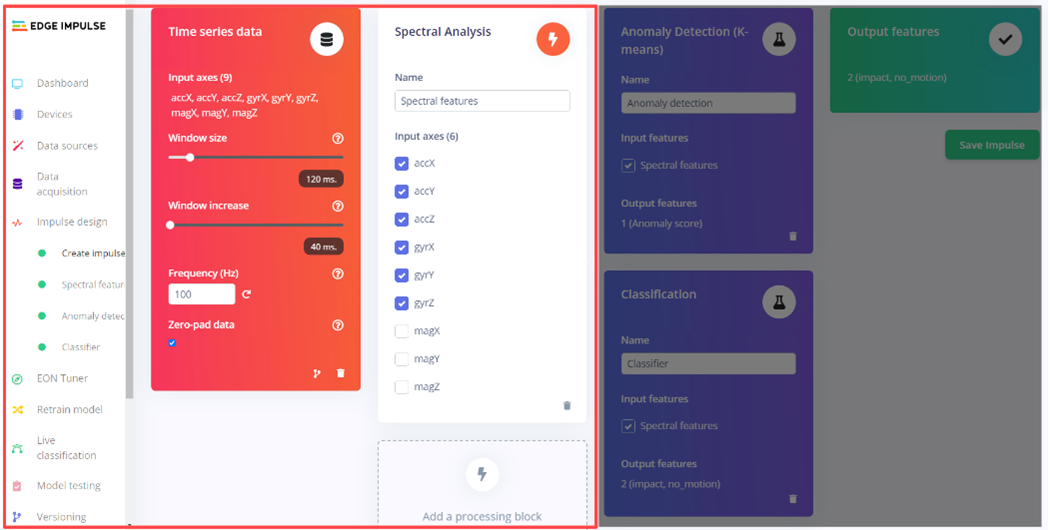 But first, let’s define what exactly Edge Impulse means by the term “impulse.” In Edge Impulse, an impulse is a machine-learning model created and optimized for deployment on edge devices. The term "impulse" conveys the idea of a small, self-contained unit of intelligence that can be deployed on a device and run independently. An impulse in Edge Impulse consists of a pre-processing pipeline, a machine-learning model, and deployment code. The pre-processing pipeline includes a series of processing blocks that transform the raw input data into a format the machine learning model can use. This will be the focus of this entry.